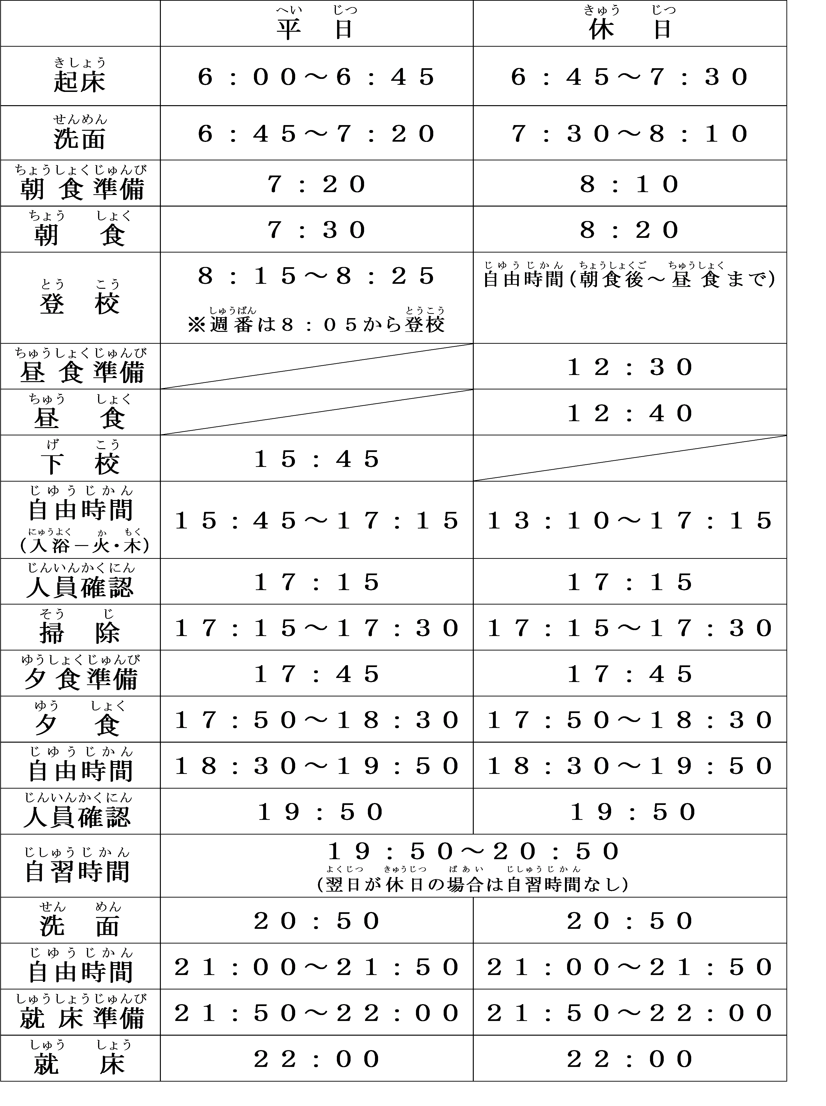 寄宿舎では、校訓である「自立・信愛・創造」を受けて、「衣、食、住」という生活の基本や社会生活の規律秩序を身につけ、将来の自立を目指しています。