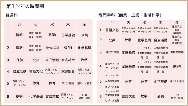 具体例として、ある年の1学年の時間割を紹介します。  ※時間割は年度ごとに変わります